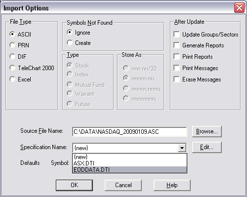 Click the Edit button and then on the following buttons; Symbol, Date, Open, High, Low, Close and Volume in. Date should be set to YYMMDD and Volume in {units}, enter EODDATA in the Specification Name field.