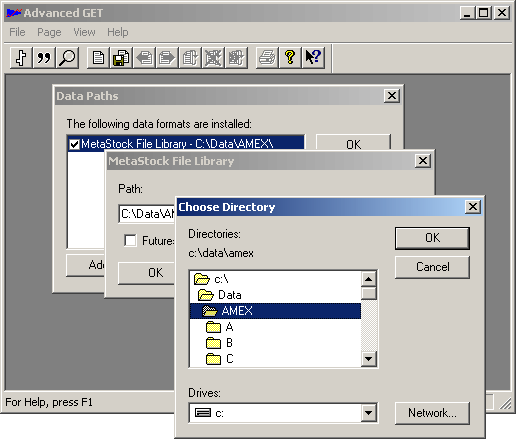 Click on Properties and then the browse button, select where your Metastock Database is located on your computer. eg. C:\Data\NYSE and then click OK. Click OK until you are back to the main screen.